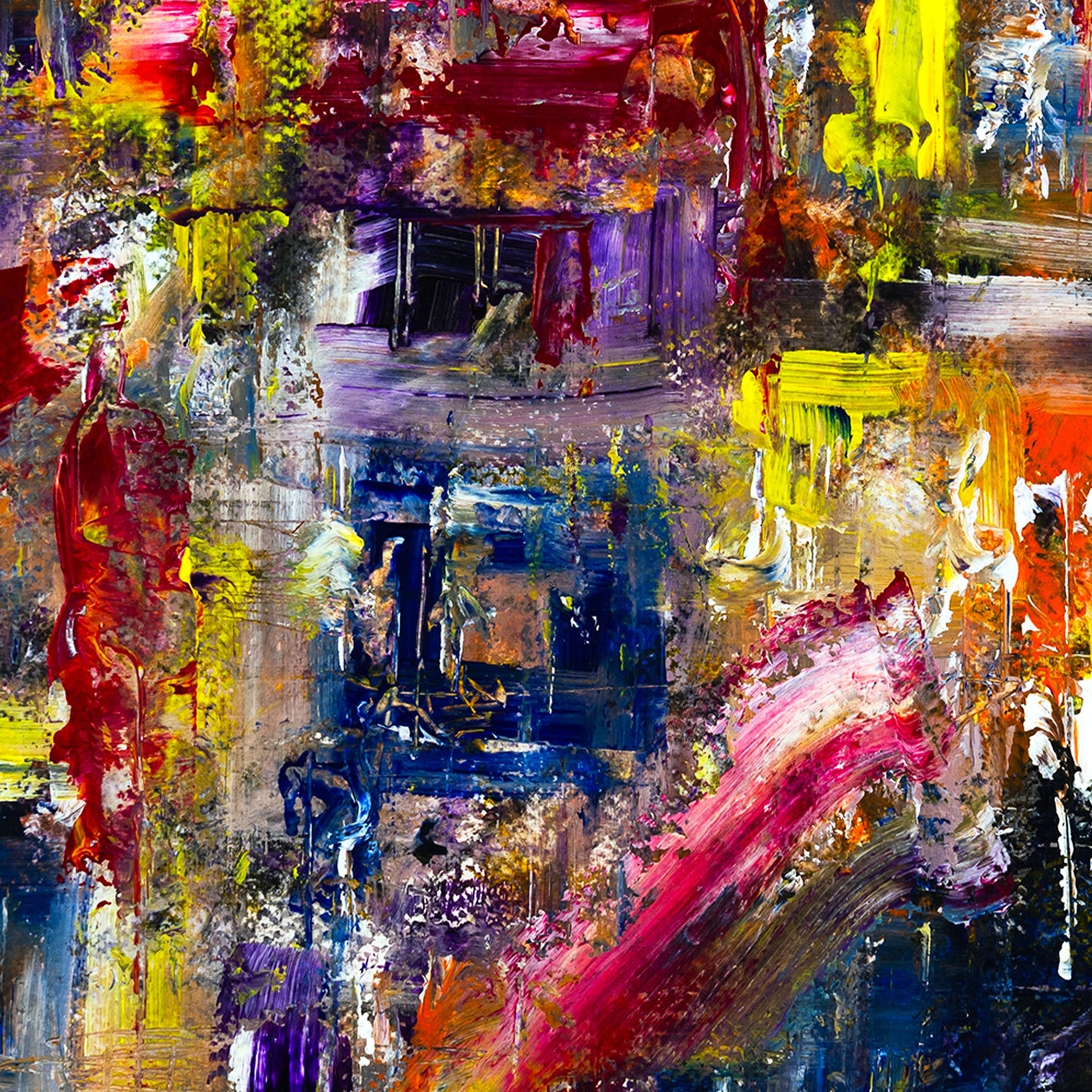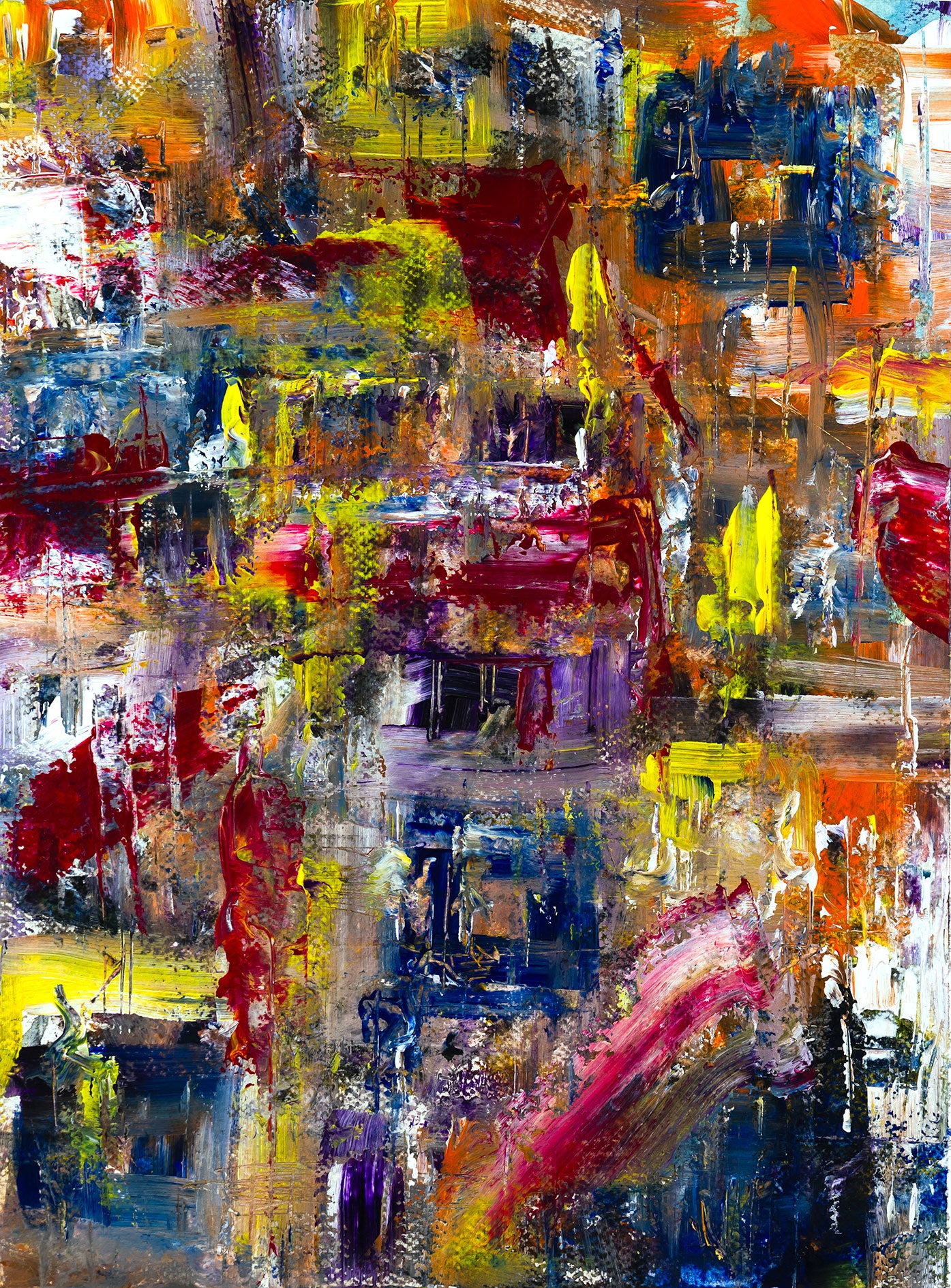 The palette is deliberate chaos: violent crimsons and electric yellows cut through pools of indigo and violet, mirroring the duality of abandon and awakening. The brushwork is impulsive, almost ecstatic — yet underneath, there’s a rhythm, a coherence that speaks to the beauty within chaos.